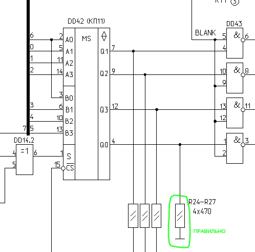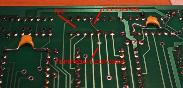 Красным цветом показана неправильная связь (так было разведено на плате). Зеленым цветом показано как надо сделать.